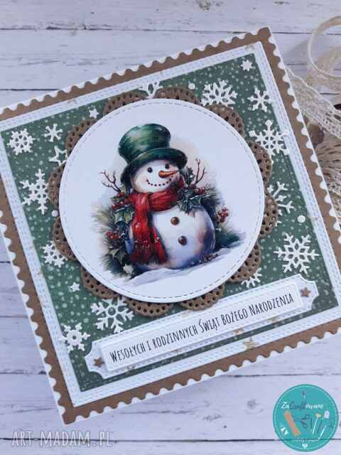 Kartka bożonarodzeniowa z bałwanem wykonana metodą scrapbookingu z wykorzystaniem profesjonalnych materiałów i z dbałością o każdy szczegół.
