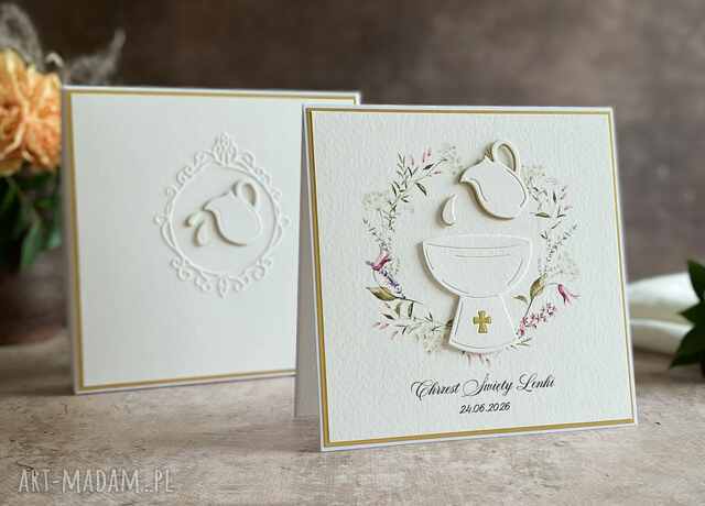 Elegancka, ręcznie wykonana, personalizowana pamiątka chrztu, kartka w pudełku z ozdobną kopertą.
