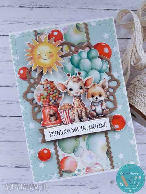 PERSONALIZACJA jest wliczona w cenę kartki. W jej zakres wchodzi umieszczenie dowolnego napisu na banerku z przodu np. „Spełnienia marzeń, [Kacperku]!”, umieszczenie życzeń wraz z podpisem i datą wewnątrz kartki oraz umieszczenie napisu na etykietce, np. „Dla Kacperka”.