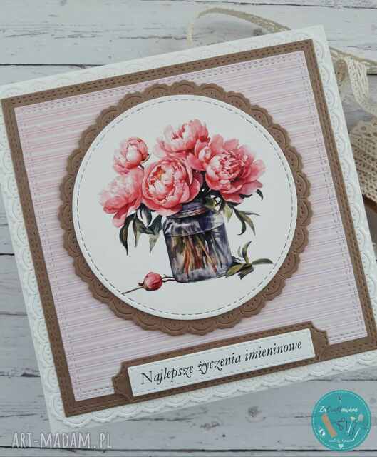Ręcznie robiona kartka imieninowa z piwoniami wykonana metodą scrapbookingu z wykorzystaniem profesjonalnych materiałów i z dbałością o każdy szczegół.