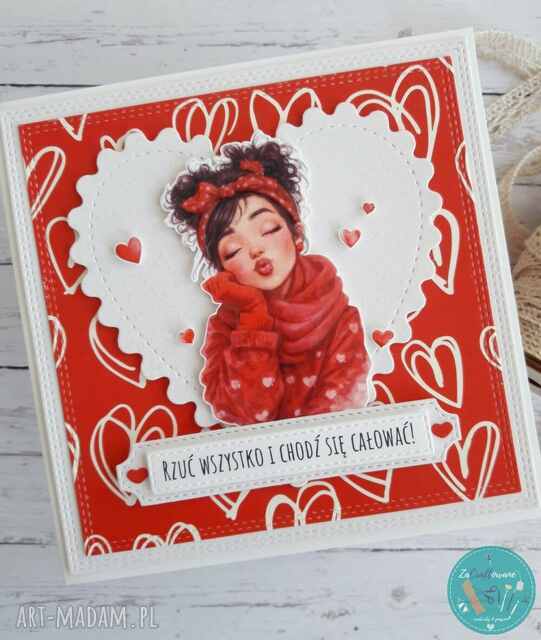 Ręcznie robiona kartka walentynkowa z całuśną dziewczyną wykonana metodą scrapbookingu z wykorzystaniem profesjonalnych materiałów i z dbałością o każdy szczegół.