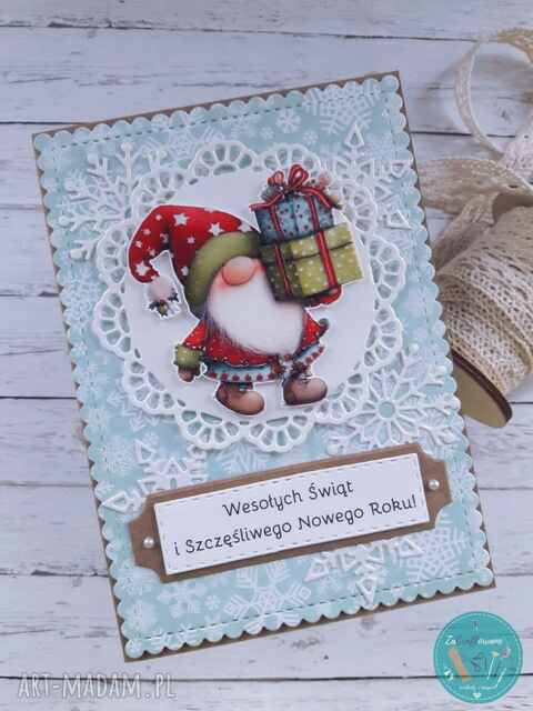 Kartka bożonarodzeniowa z gnomem z lekkim efektem 3D wykonana metodą scrapbookingu z wykorzystaniem profesjonalnych materiałów i z dbałością o każdy szczegół.