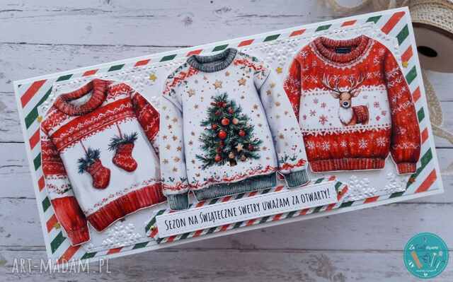 Motywem głównym kartki są swetry świąteczne z różnymi motywami bożonarodzeniowymi, które wprowadzą do każdego domu radosną atmosferę.