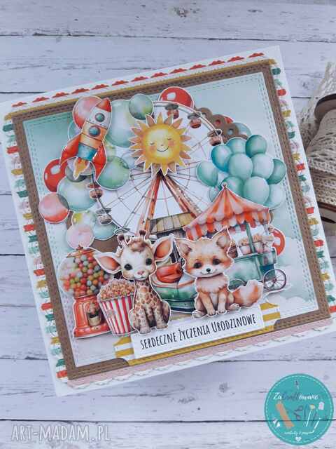 Wesoła kartka urodzinowa w żywych kolorach, której motywem przewodnim jest wesołe miasteczko i urocze zwierzątka, gotowe na świętowanie urodzin z małą solenizantką lub małym solenizantem.