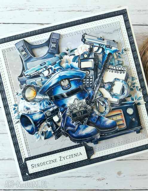 Warstwowa kartka z okazji urodzin albo imienin dla policjanta z efektem 3D wykonana metodą scrapbookingu z wykorzystaniem profesjonalnych materiałów i z dbałością o każdy szczegół.