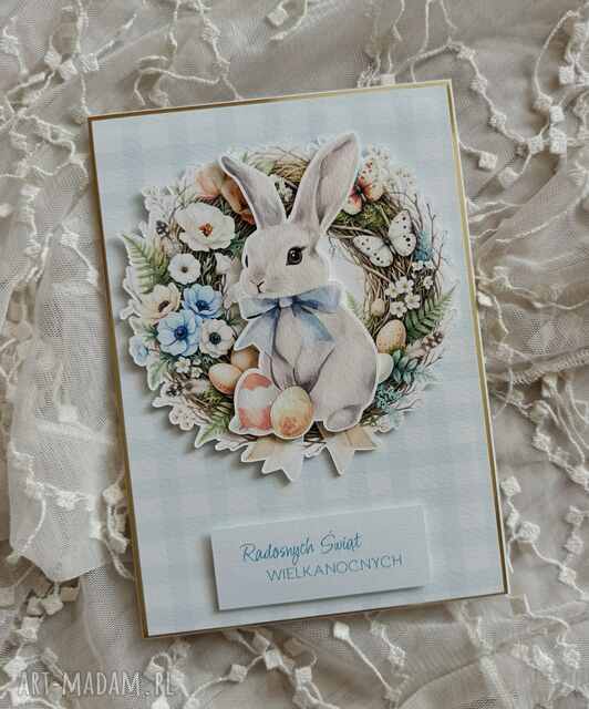 Prezent pod choinkę niebieska kartka wielkanocna z królikiem. Scrapbooking kartki handmade Delikatna kartka z króliczkiem wielkanocnym, by przekazać ciepłe życzenia bliskim28,00 zł