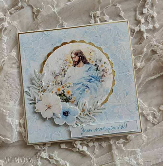 Pomysł na upominki kartka wielkanocna z jezusem i wiankiem. Scrapbooking kartki handmade Delikatna kartka z jezusem i wiankiem wielkanocnym, świąteczny klimat, Idealna, Wymiary28,00 zł