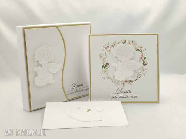 Elegancka, ręcznie wykonana pamiątka chrztu dla dziewczynki, kartka w pudełku z ozdobną kopertą. Delikatne i subtelne połączenie bieli i matowego złota.