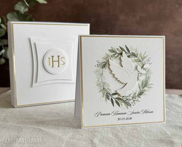Elegancka, ręcznie wykonana, personalizowana pamiątka Pierwszej Komunii Świętej w pudełku z ozdobną kopertą na pieniądze lub drobny upominek.