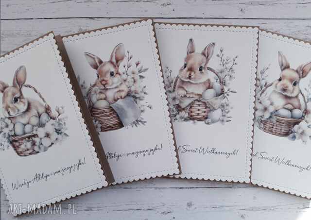 Motywem przewodnim kartek są grafiki o tematyce wielkanocno-wiosennej z uroczymi króliczkami w koszyczkach. Kartki będą idealne do złożenia życzeń wielkanocnych i umilenia okresu oczekiwania na te wyjątkowe święta.