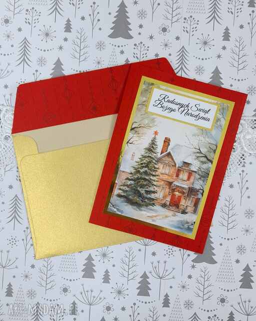 handmade kartka świąteczna czerwono - złota z kieszonką i grafiką z zimowym domkiem